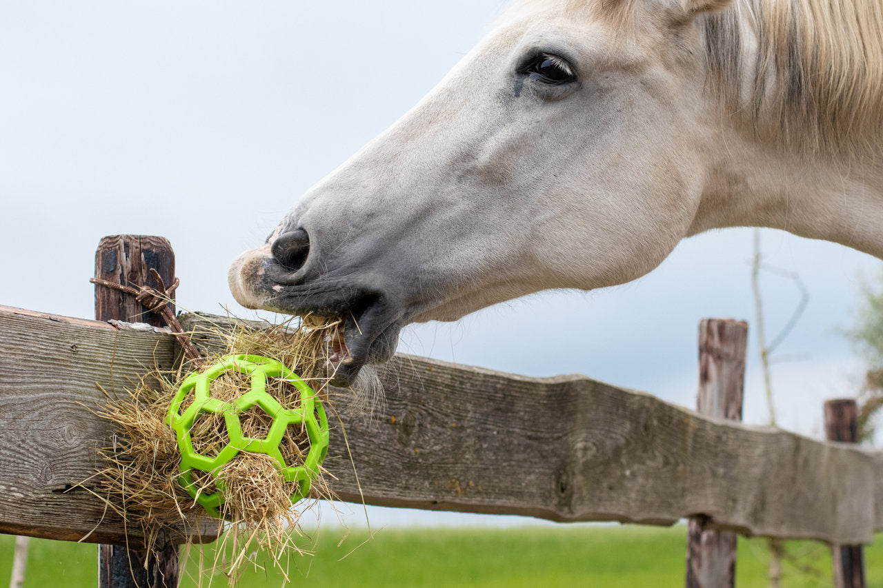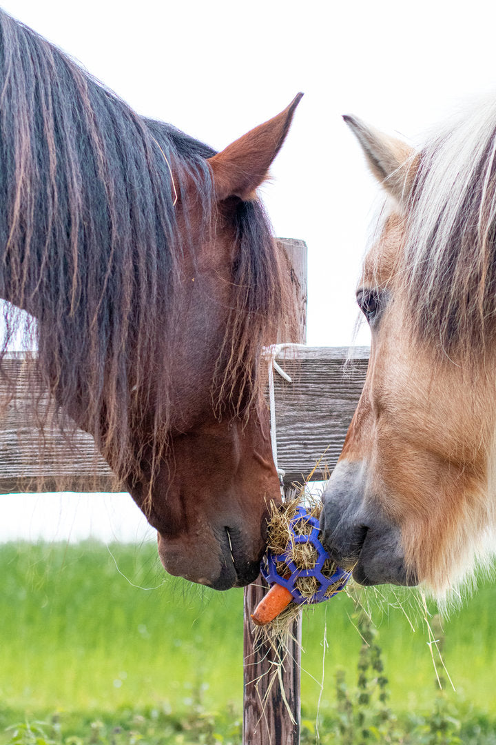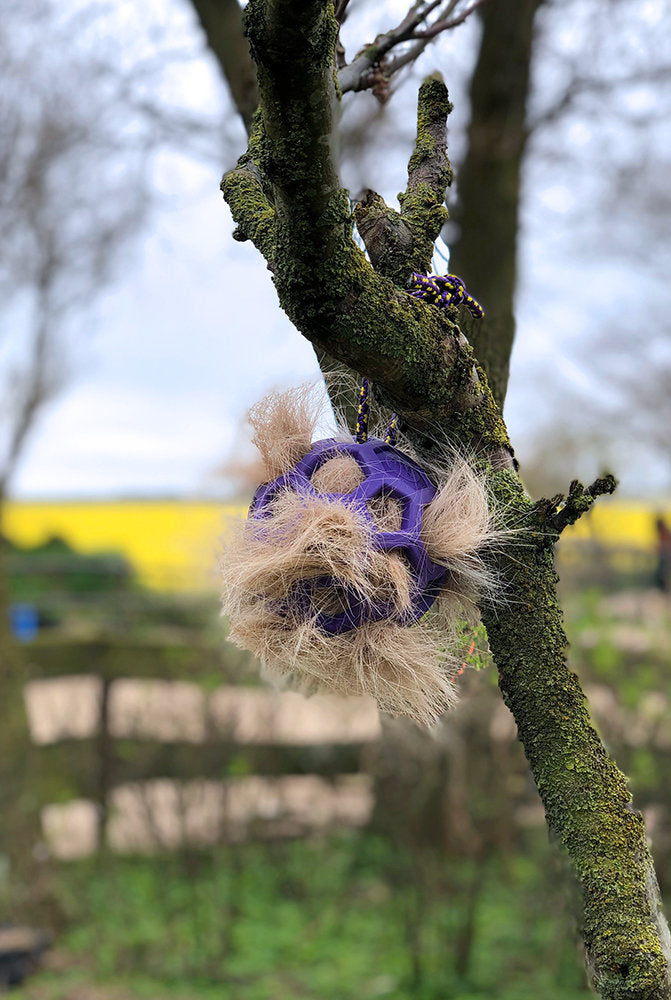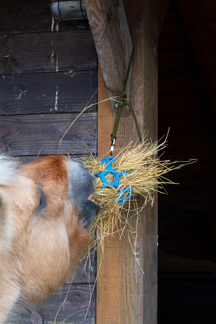 Hang de flexibele hooibal op in de paddock of op stal en vul deze met ruwvoer zoals hooi, gras, takken, kruiden en groente.